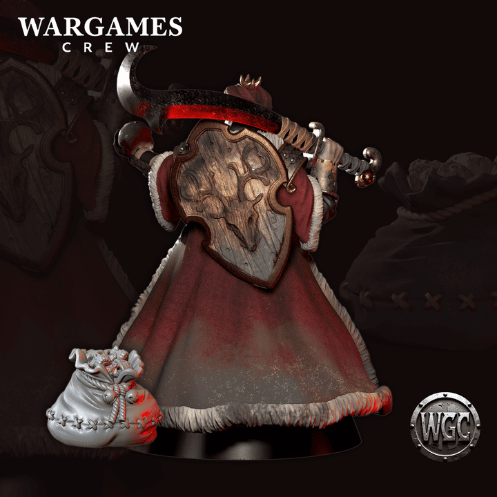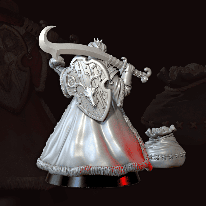 Across his back rests a bulging sack, the kind storytellers might call a bag of gifts. Yet within lie the trophies of his sacred hunt: skulls of heretics, polished and marked with protective scripture, each one a grim testament to battles fought in places no map records. Some skulls whisper faintly when the night is cold enough, as if the remnants of damned souls trapped within still beg for release. The Sentinel carries them not as spoils but as warnings, holy talismans against corruption. In battle, he offers these grim “gifts” with an outstretched hand, as though presenting a blessing — or a judgment. His enemies rarely understand which until it is too late.